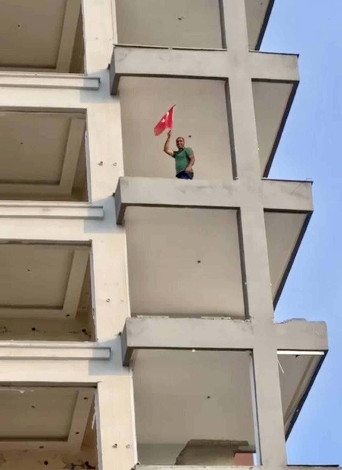 Yıkımı gerçekleştiren iş makinesi operatörü, binanın sekizinci katındaki balkonda asılı Türk bayrağını görünce çalışmayı durdurdu.