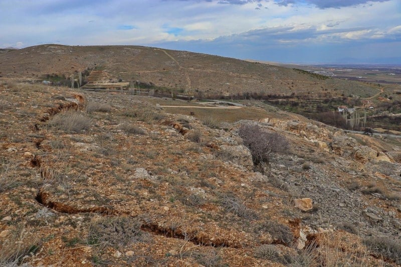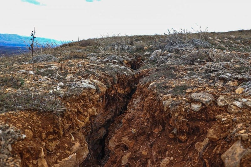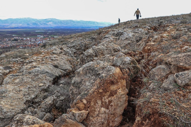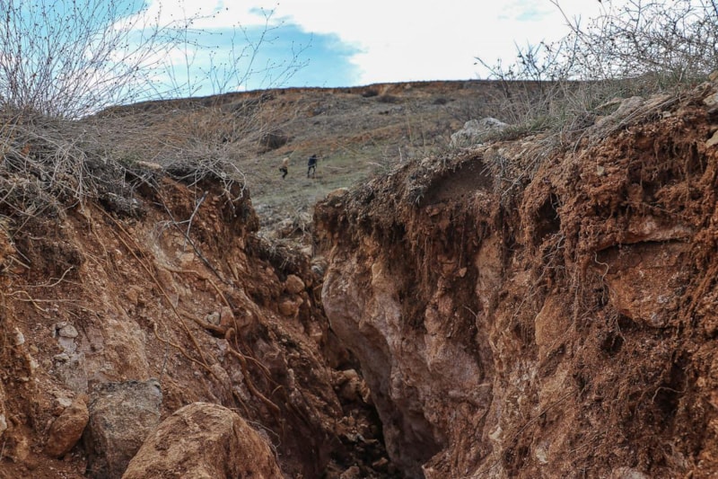 Tepelik noktada yer alan kayaların yarıldığı arazide de metrelerce uzunlukta çatlaklar oluştuğu gözlendi.