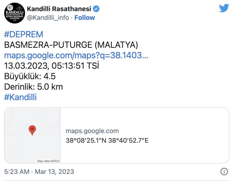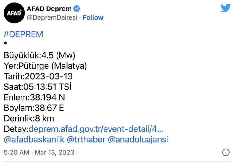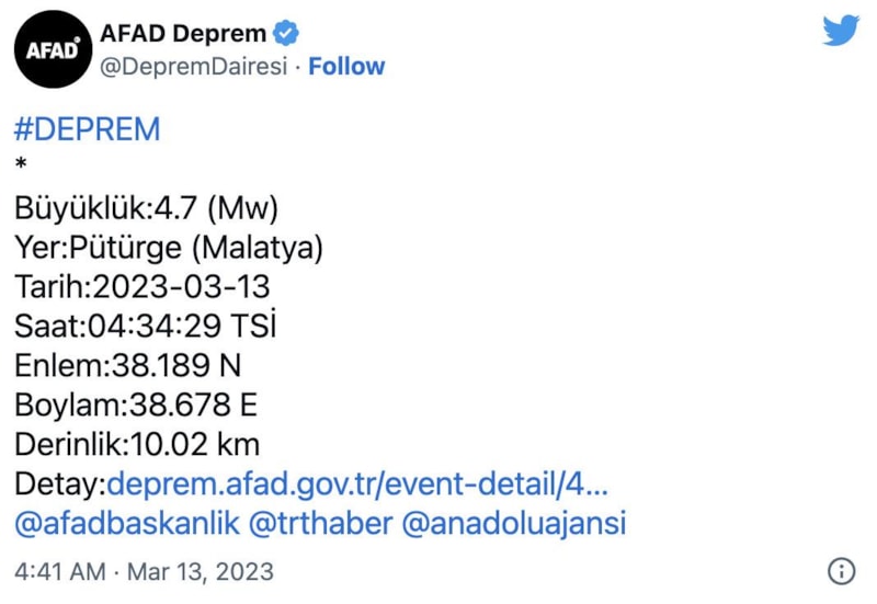 AFAD'dan yapılan açıklamalara göre Malatya'nın Pütürge ilçesinde saat 04.34'te 4.7 büyüklüğünde, 05:13'te de 4.5 büyüklüğünde deprem oldu. Kandilli Rasathanesi ilk depremin büyüklüğünü 4.8 olarak duyurdu.