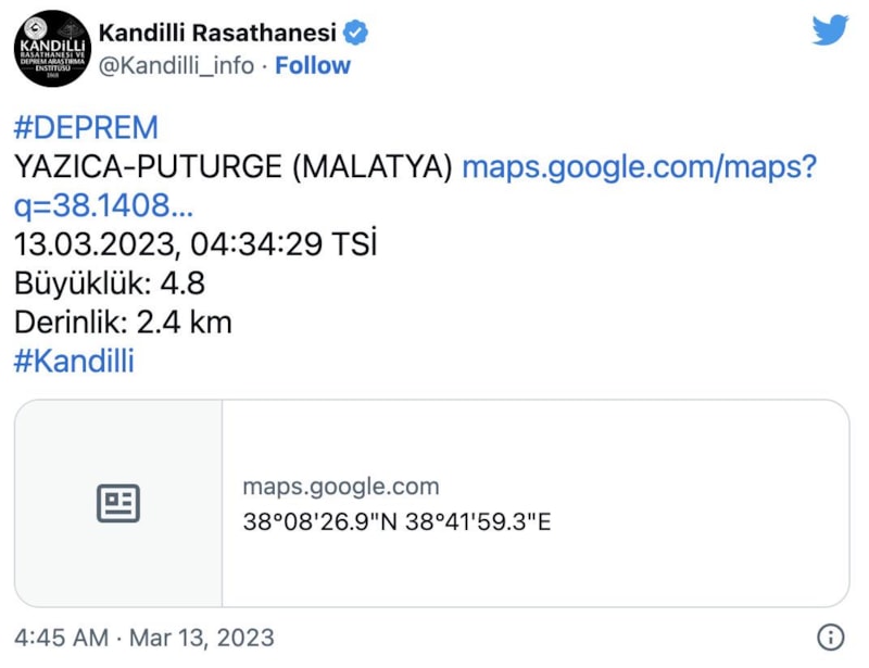 Kandilli Rasathanesi ise ilk depremin şiddetini 4.8, derinliğini 2.7 km olarak açıkladı.