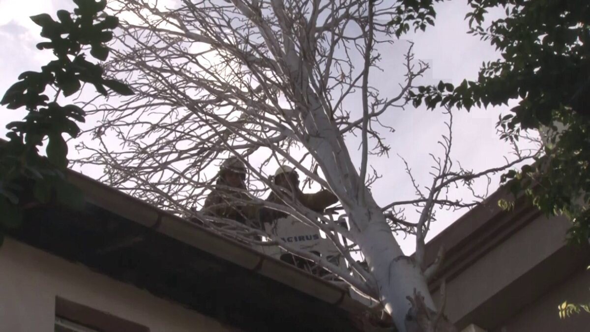 Çatıya yaslanarak duran ağacı görenler durumu itfaiyeye bildirdi. Olay yerine gelen ekipler, çatıya çıkarak ağacı en tepesinden testereyle kesmeye başladı. Dallarının kesilmesinin ardından ağaç devrildiği yerden alındı.