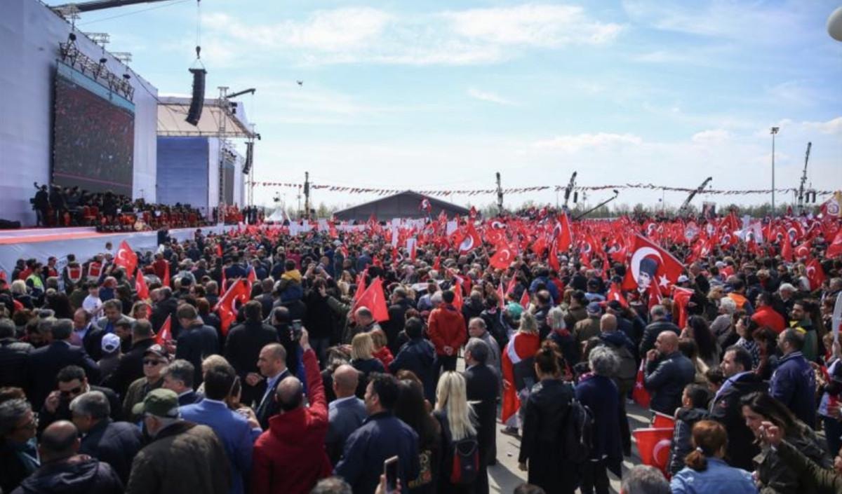 Miting öncesi ise kalabalığı coşturmak için bazı şarkılar alanda çalınmaya başlandı.