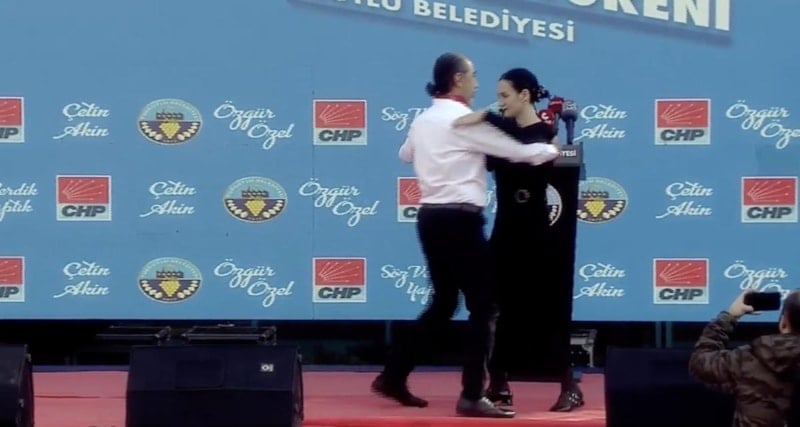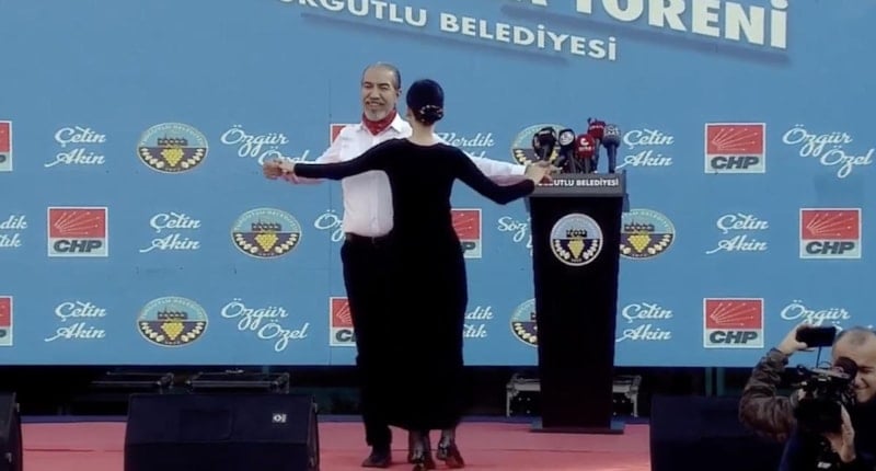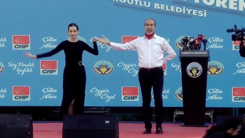 Turgutlu Belediye'nin temel atma törenine katılan Özgür Özel için saygı duruşu ve İstiklal Marşı'ndan sonra vals gösterisi düzenlendi.