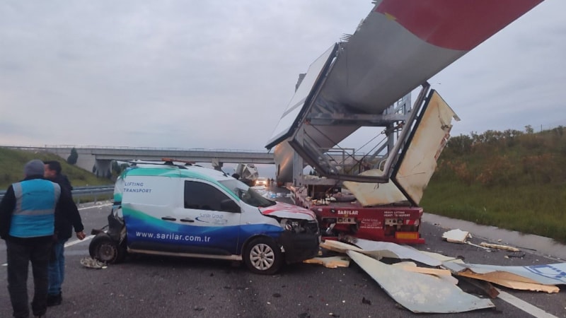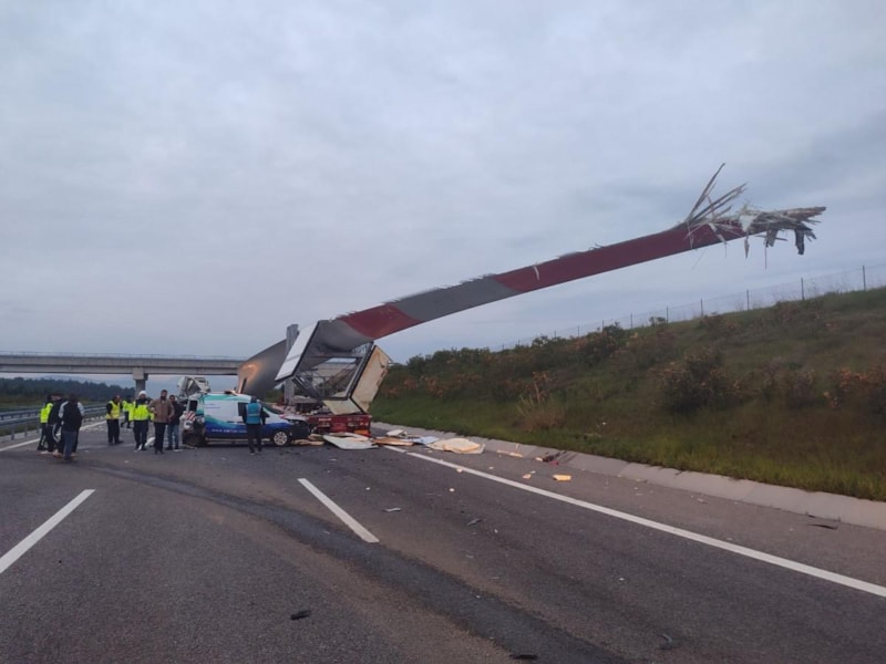 Önce önündeki hafif ticari araca, ardından metrelerce uzunluğundaki rüzgar türbini pervanesi taşıyan tıra çarptı.