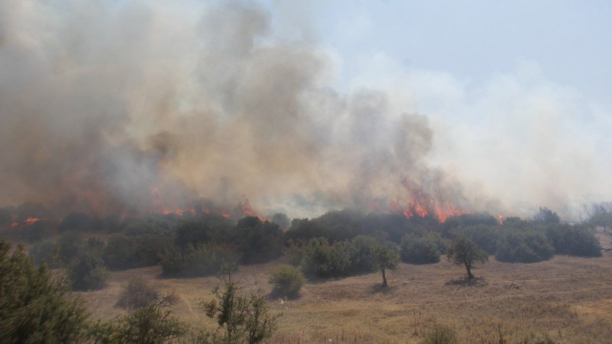Rüzgarın da etkisiyle kısa sürede büyüyen yangın, yaklaşık 100 dönüm alanda etkili oldu.