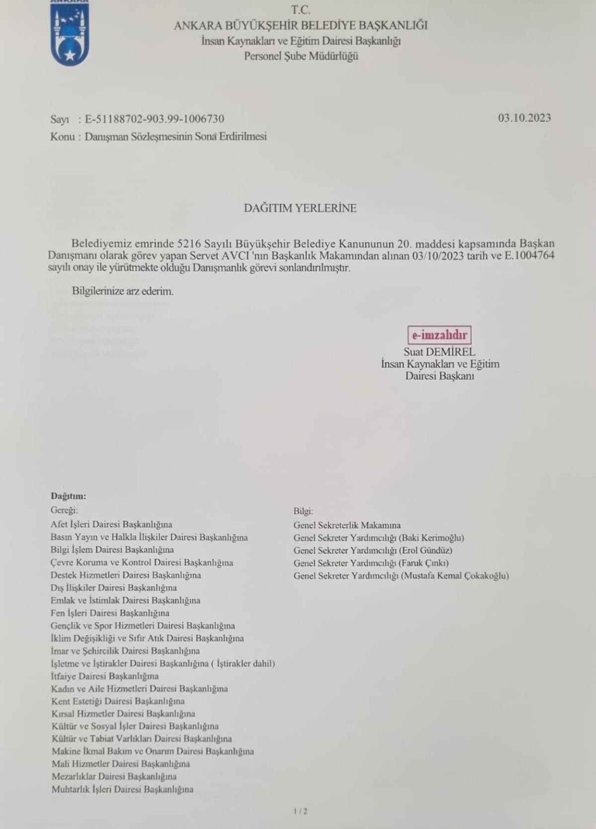 Ankara Büyükşehir Belediye Başkanı Mansur Yavaş, uzun süredir partililerle gerilim yaşayan başdanışmanı Servet Avcı'nın görevine son verdi.