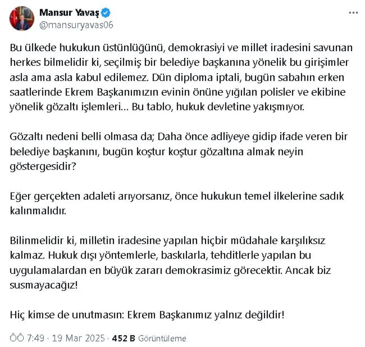Dün diploma iptali, bugün sabahın erken saatlerinde Ekrem Başkanımızın evinin önüne yığılan polisler ve ekibine yönelik gözaltı işlemleri. Bu tablo, hukuk devletine yakışmıyor.