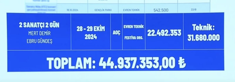 Konuya ilişkin grafikler paylaşan Yavaş, 28 ve 29 Ekim'de Mert Demir ve Ebru Gündeş olmak üzere 2 konser düzenlendiğini, söz konusu iddiada olduğu gibi 69 milyon TL değil toplam 44 milyon 937 bin TL harcandığını belirtti.