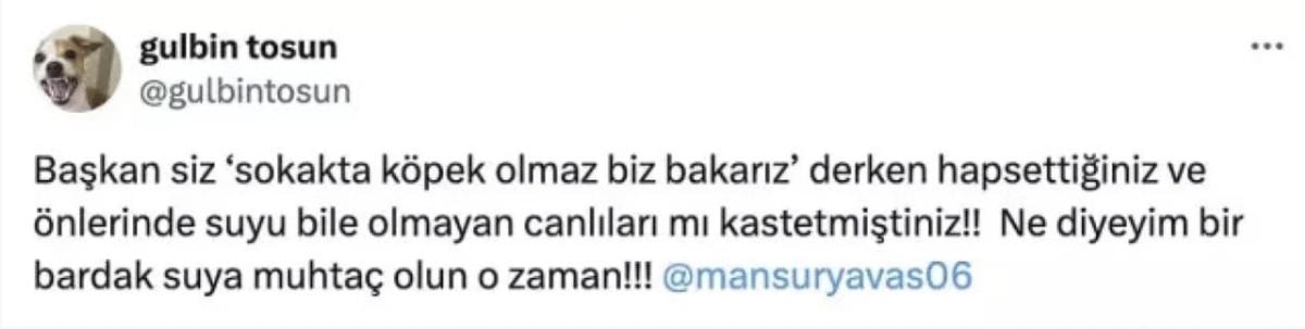 Paylaşımlarında sert ifadeler kullanan Tosun, “Başkan siz ‘sokakta köpek olmaz biz bakarız’ derken hapsettiğiniz ve önlerinde suyu bile olmayan canlıları mı kastetmiştiniz! Ne diyeyim bir bardak suya muhtaç olun o zaman!!!” diye yazmıştı.