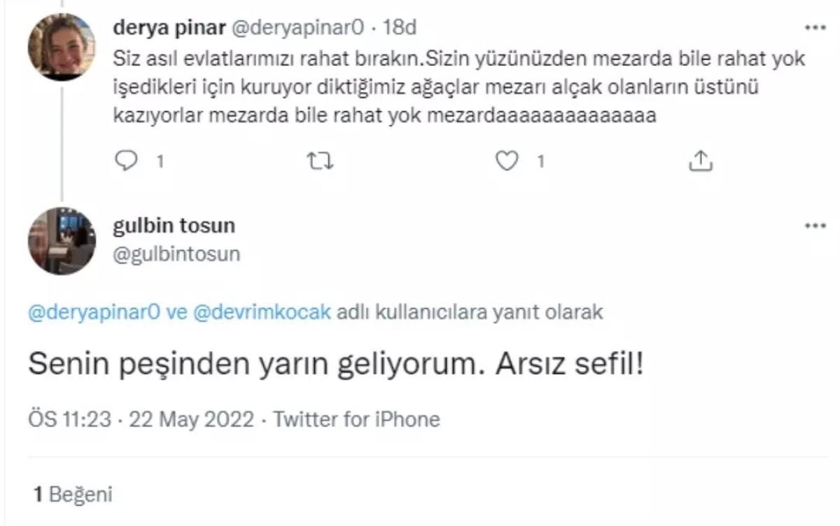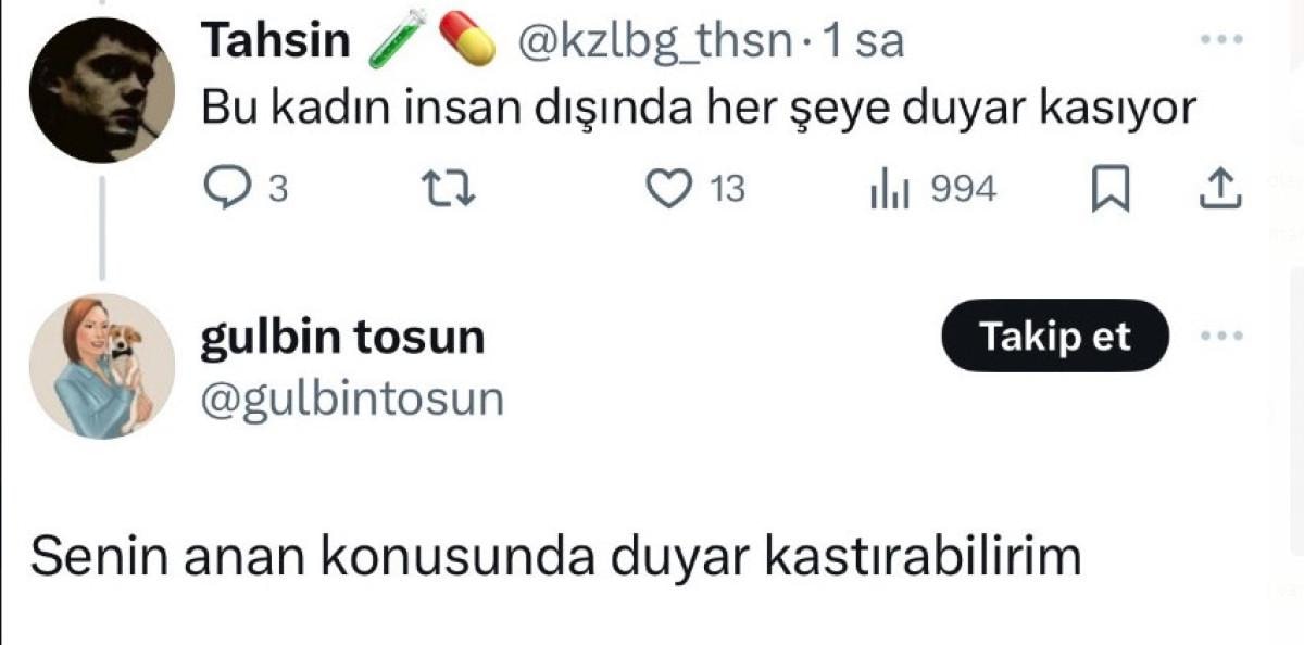 Öte yandan Gülbin Tosun bilindiği üzere Antalya'da başıboş köpeklerden kaçarken trafik kazası geçirerek hayatını kaybeden küçük Mahra Melin Pınar'ın annesiyle de X hesabı üzerinden tartışmış ve tepki çeken ifadeler kullanmıştı.