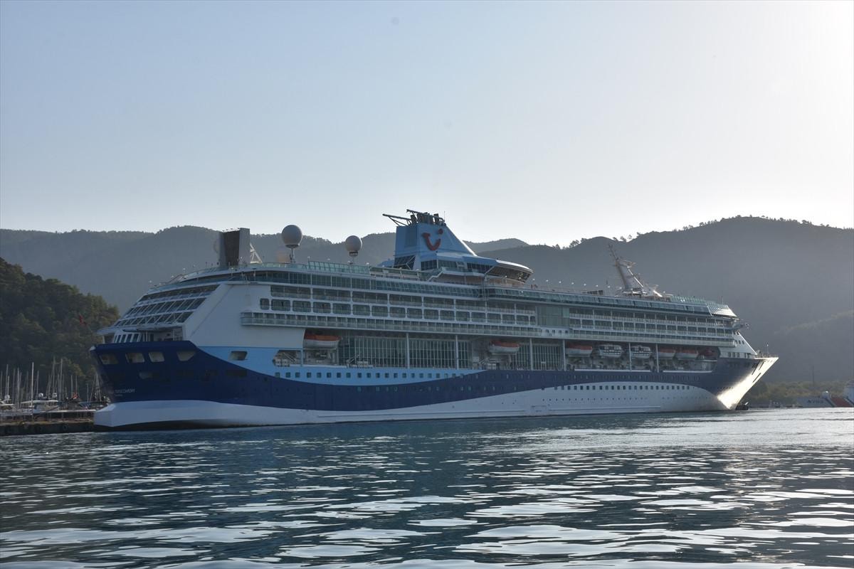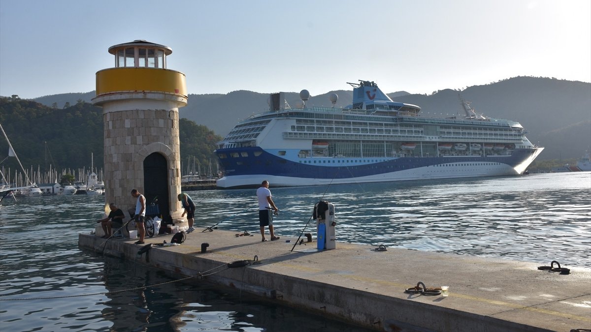 Santorini Adası'ndan gelen ve Marmaris Limanı'nın büyük iskelesine yanaştırılan gemide, çoğu İngiliz 1801 yolcu ve 753 personel bulunduğu belirtildi.