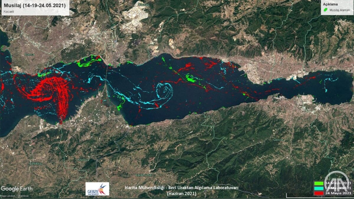 Gebze Teknik Üniversitesi (GTÜ) Harita Mühendisliği Bölümü tarafından optik ve termal uydu görüntüleri kullanılarak çıkarılan haritalar, müsilajın yayılma alanının genişliğini ortaya koydu.