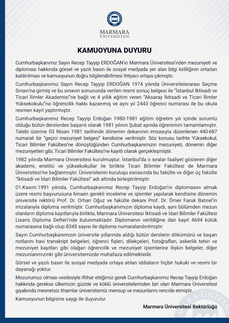 Cumhurbaşkanımız Sayın Recep Tayyip Erdoğan'ın Marmara Üniversitesi'nden mezuniyeti ve diploması hakkında görsel ve yazılı basın ile sosyal medyada yer alan bilgi kirliliğinin ortadan kaldırılması ve kamuoyunun doğru bilgilendirilmesi ihtiyacı ortaya çıkmıştır.