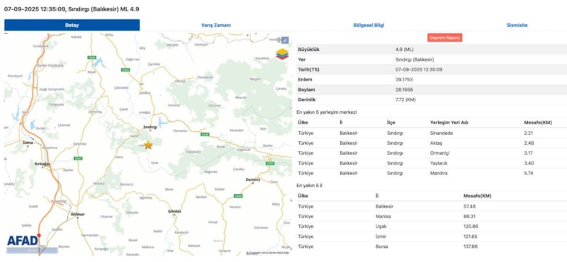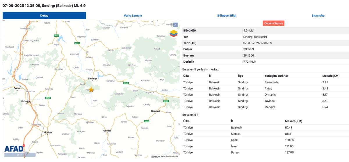 AFAD, saat 12.35'te merkez üssü Balıkesir'in Sındırgı ilçesi olan 4.9 büyüklüğünde deprem meydana geldiğini açıkladı.