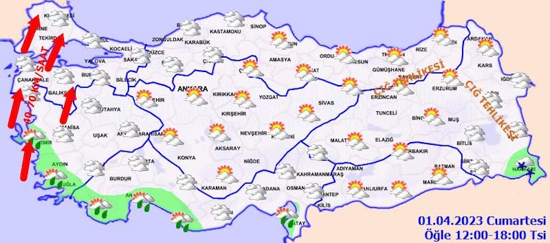 Yapılan açıklamada cumartesi günü Marmara ve Ege bölgelerinde rüzgarın güney ve güneybatı (lodos) yönlerden kuvvetli; İstanbul, Tekirdağ, Kırklareli, Edirne, Çanakkale, Balıkesir, Bursa, İzmir ve Manisa çevrelerinde kuvvetli, yer yer hamleli fırtına (50-70 km/saat, yüksek kesimlerde 70-80 km/saat) şeklinde eseceği bildirildi.