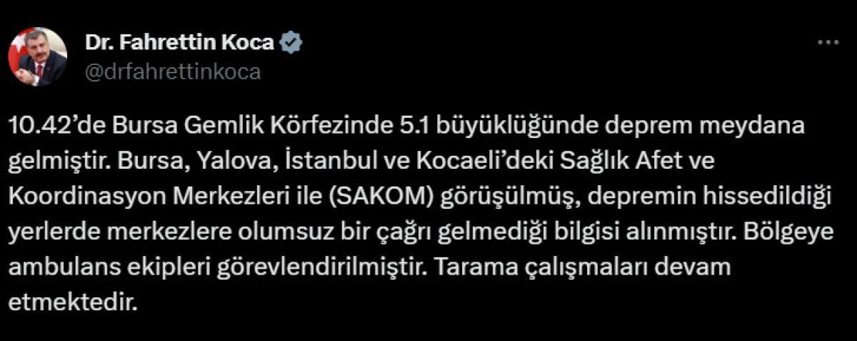 10.42’de Bursa Gemlik Körfezinde 5.1 büyüklüğünde deprem meydana gelmiştir. Bursa, Yalova, İstanbul ve Kocaeli’deki Sağlık Afet ve Koordinasyon Merkezleri ile (SAKOM) görüşülmüş, depremin hissedildiği yerlerde merkezlere olumsuz bir çağrı gelmediği bilgisi alınmıştır. Bölgeye ambulans ekipleri görevlendirilmiştir. Tarama çalışmaları devam etmektedir.