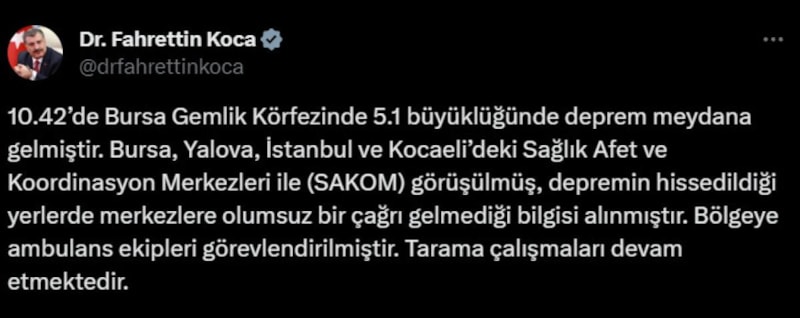 Merkez üssü Marmara Denizi Gemlik Körfezi olan 5.1 büyüklüğünde deprem meydana geldi. Depremden sonra açıklama yapan Bakan Koca, "Depremin hissedildiği yerlerde merkezlere olumsuz bir çağrı gelmediği bilgisi alınmıştır" dedi.