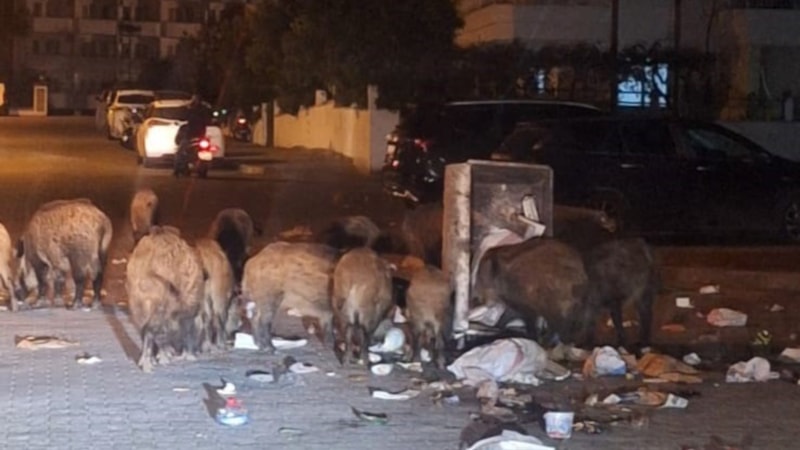 Domuzlar çöple dolu kutuları devirip hem halk sağlığını tehdit ederken, aynı zamanda sokak hayvanlarına da saldırıyor.
