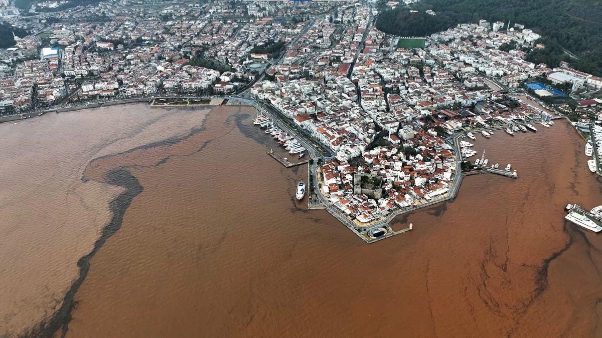 Dron ile görüntülen Marmaris yat limanı, Atatürk Bulvarı ve Kısayalı sahili tamamen kahverengiye dönüşürken, Marmaris’in mavi ve turkuaz rengi kayboldu.
