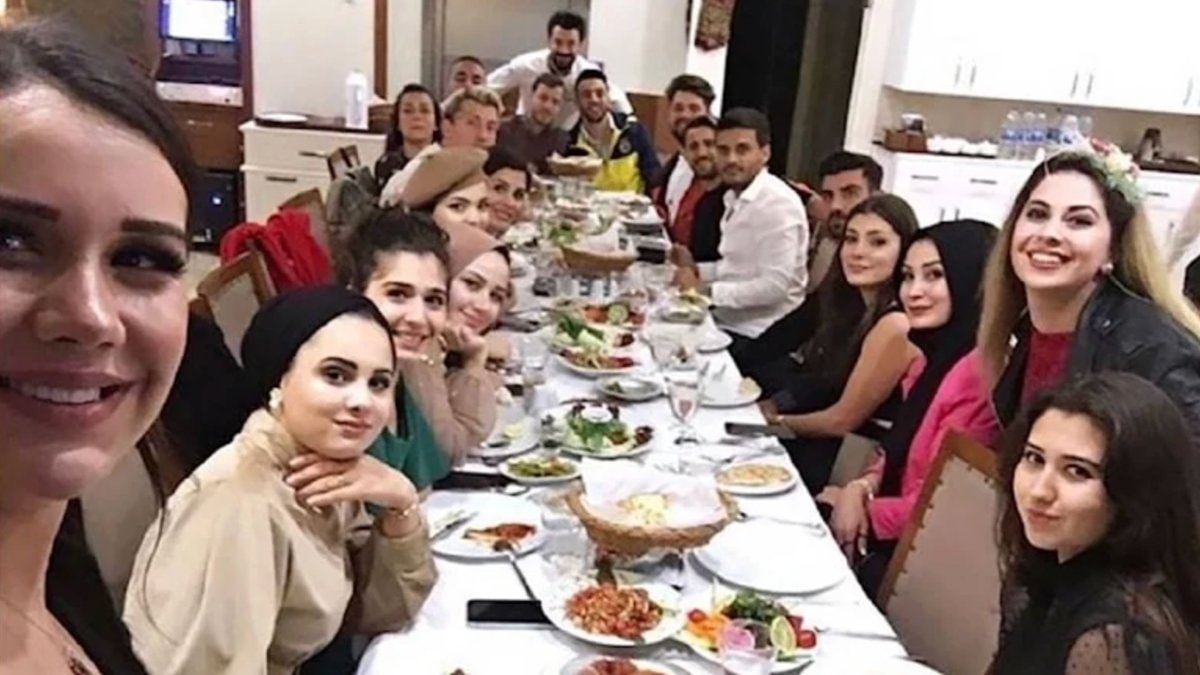 Yemek masasında çekilen fotoğrafta kara para aklamakla suçlanan tutuklu Dilan-Engin Polat çifti, Merve Nur Akyüz, İleyda Topal, Tolunay Topal, Kenan Öztürk, Eylül Öztürk, Nez Demir, Yasemin Yiğit ve eşi Murat Yiğit bulunuyor.