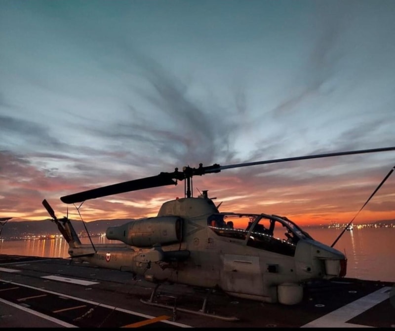 Havadan çekilen görüntülerde geminin üzerinde 10 savaş helikopteri yer aldı.