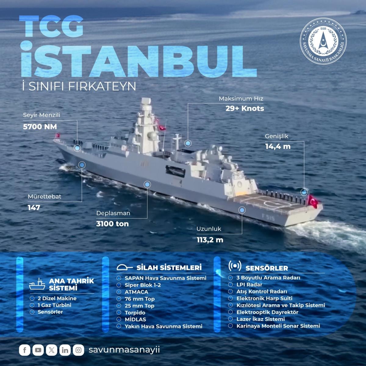 TCG İstanbul, İSTİF sınıfı fırkateyn projesi kapsamında inşa edildi. 113.2 metre uzunluğundaki gemi, ileri karakol faaliyetlerinin icrasında kullanılabilecek.