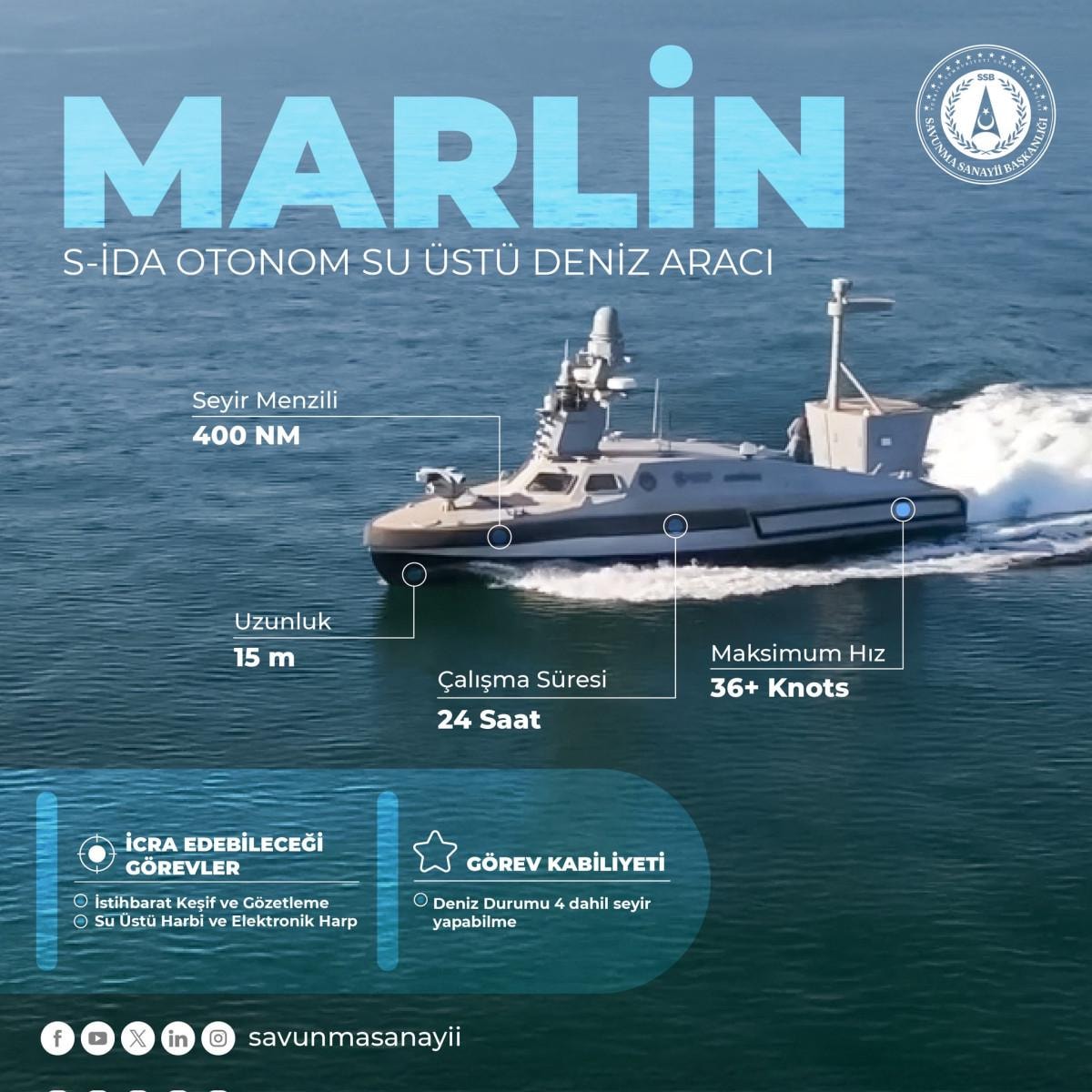 Savunma Sanayii Başkanlığı koordinasyonunda ASELSAN ve SEFİNE Tersanesi iş birliğinde yerli ve milli olarak geliştirilen Marlin'in, kıyı veya açık denizde savunma ve taarruz maksatlı deniz harbi operasyonlarında kullanılması planlanıyor.