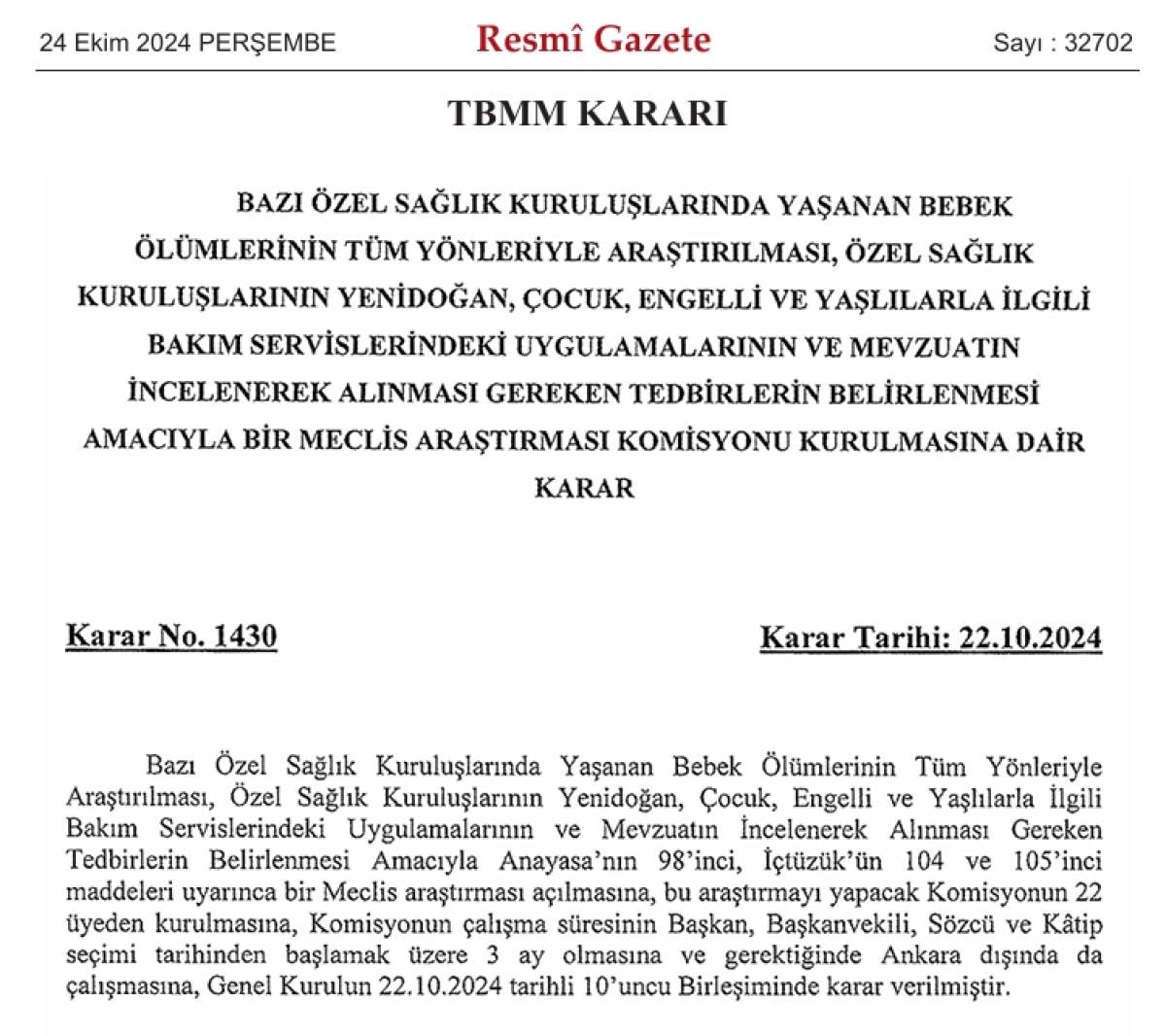 Resmi Gazetede yayımlanan, "Bazı Özel Sağlık Kuruluşlarında Yaşanan Bebek Ölümlerinin Tüm Yönleriyle Araştırılması, Özel Sağlık Kuruluşlarının Yenidoğan, Çocuk Engelli Ve Yaşlılara İlgili Bakım Servislerindeki Uygulamalarının Ve Mevzuatın İncelenerek Alınması Gereken Tedbirlerin Belirlenmesi Amacıyla Bir Meclis Araştırma Komisyonu Kurulmasına Dair Karar" ile 22 üyeden oluşacak komisyonun çalışma süresi 3 ay olacak ve gerektiğinde Ankara dışında da çalışabilecek.