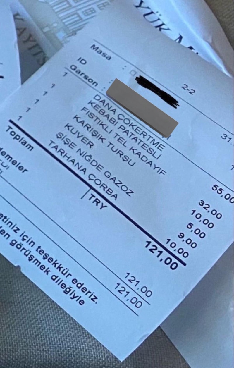 Söz konusu adisyonda tarhana çorbası, dana çökertme kebabı, fıstıklı tel kadayıf, karışık turşu ve gazoz olduğu görüldü.