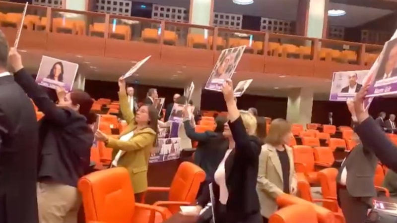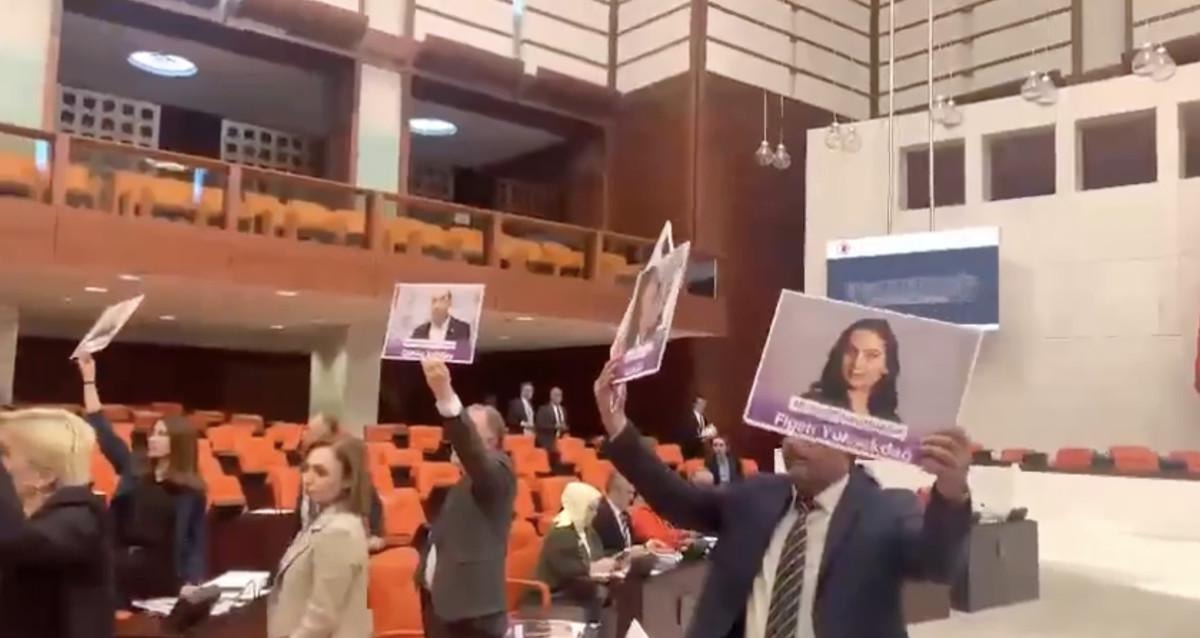 Selehattin Demirtaş ve birçok ismin görsellerini ellerine alan DEM Partili milletvekilleri, ellerini masaya vurarak tepki gösterdi.