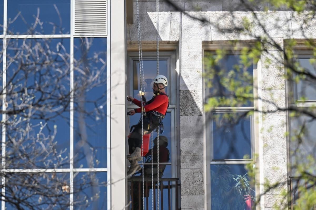 İş sağlığı ve güvenliği kuralları kapsamında Meclis yerleşkesinde bulunan binaların camları ve yüksek bölümler, dağcılık eğitimi almış profesyonel ekipler tarafından silinerek temizlendi. Önceki yıllarda vinç yardımıyla yapılan temizlik bu kez dağcılık sertifikalı ekiplerce halatla çıkılarak gerçekleştirildi.