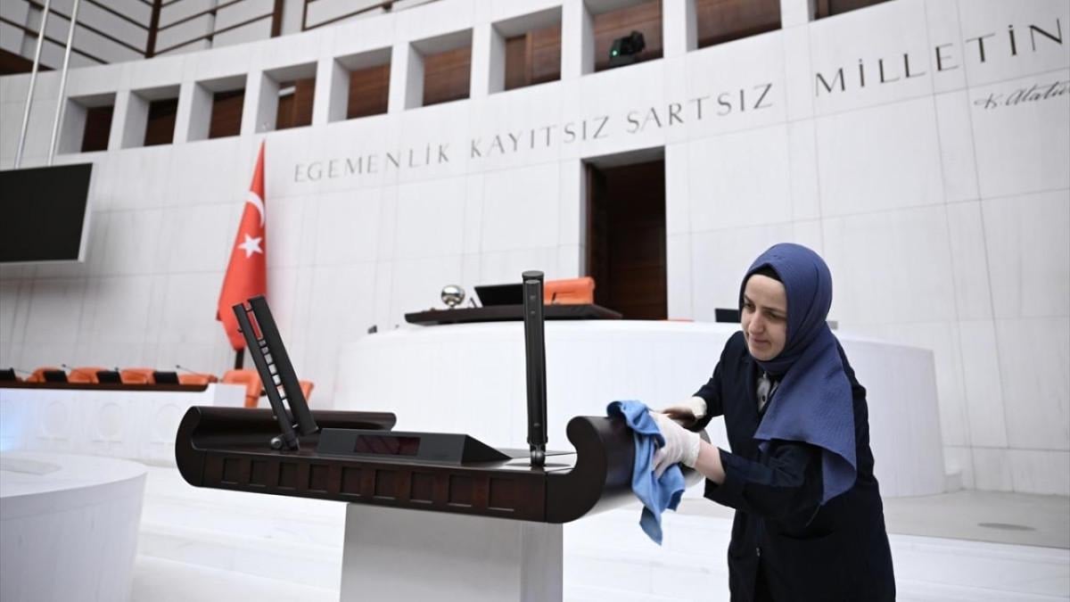 Bayramdan sonra mesaiye başlayacak olan TBMM'de hummalı temizlik çalışması yapılarak Meclis'in tüm alanları milletvekillerinin kullanımına hazır hale getirildi.