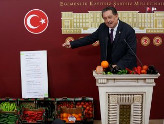 CHP Antalya Milletvekili Aydın Özer, sebze ve meyve fiyatlarındaki artışı eleştirmek için kasalara yerleştirilmiş domates, portakal, patlıcan, sivri ve kapya biberlerle, Meclis'te basın toplantısı düzenledi.