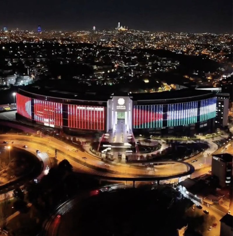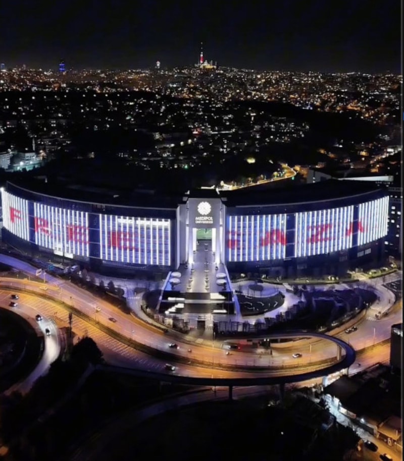 Medipol Üniversitesi, İsrail'in Gazze'de uyguladığı soykırıma dikkat çekmek amacıya, üniversite binasına Türk bayrağı ve Filistin bayrağını yansıttı.