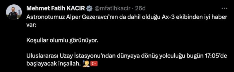 Kacır, “Astronotumuz Alper Gezeravcı’nın da dahil olduğu Ax-3 ekibinden iyi haber var; koşullar olumlu görünüyor. Uluslararası Uzay İstasyonu’ndan dünyaya dönüş yolculuğu bugün 17.05’te başlayacak inşallah.” ifadelerini kullandı.