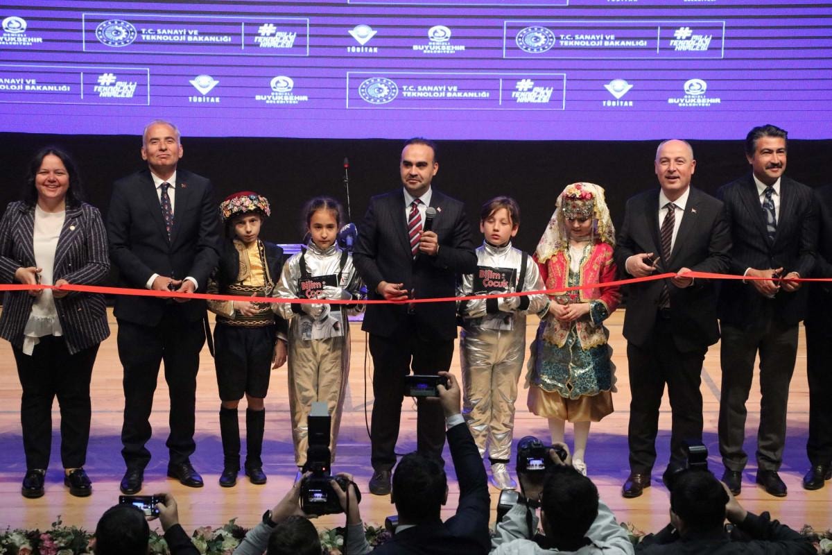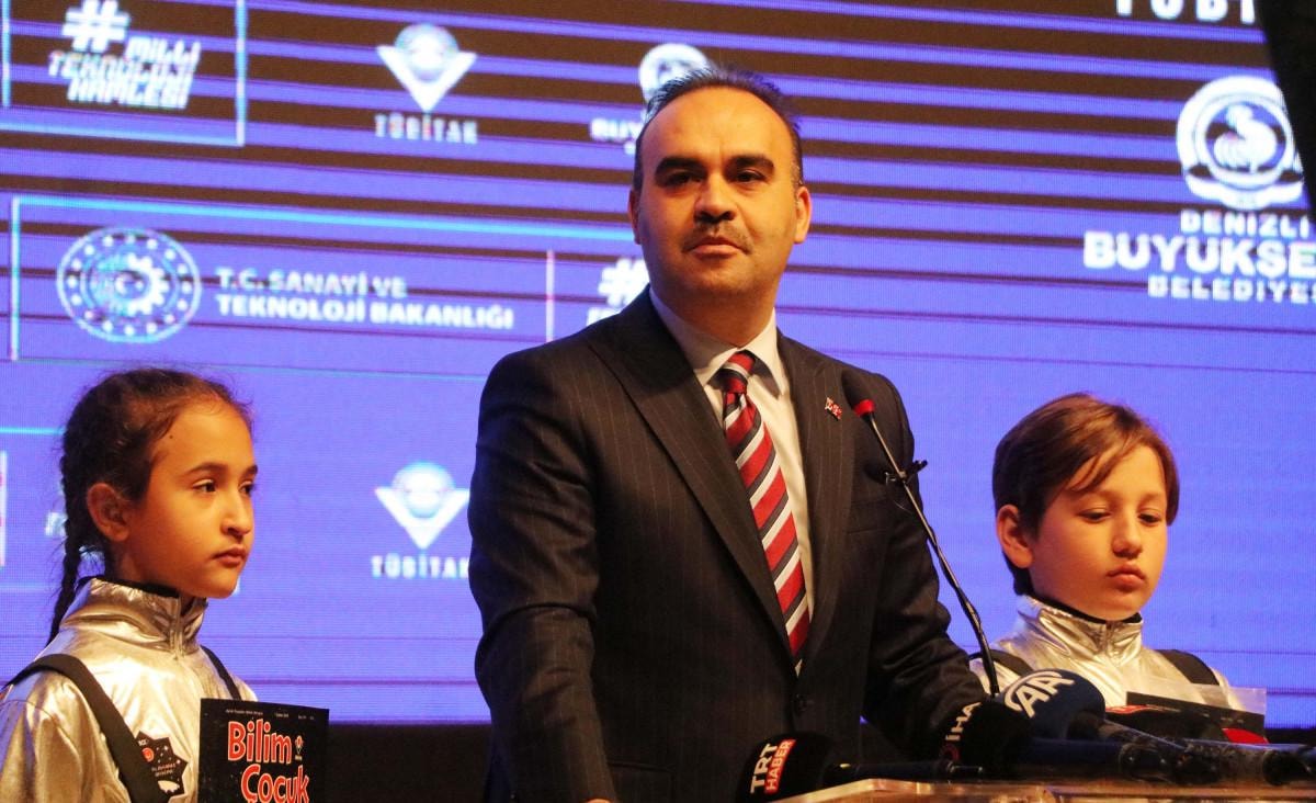 Bakan Kacır, kürsüye Denizli Bilim Merkezi'nde uzay ve havacılık atölyesi kıyafetleri giyen 10 yaşındaki Ayşe Meva Sadırlı ve Kemal Cabbar ile birlikte çıktı.