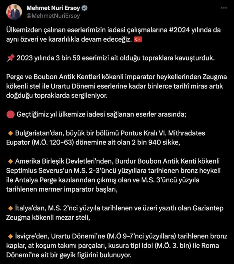 Kültür ve Turizm Bakanı Mehmet Nuri Ersoy, Türkiye’den yasa dışı yollarla çıkarılan kültür eserleri için yapılan iade çalışmaları ile ilgili sosyal medya hesabından açıklamalarda bulundu.