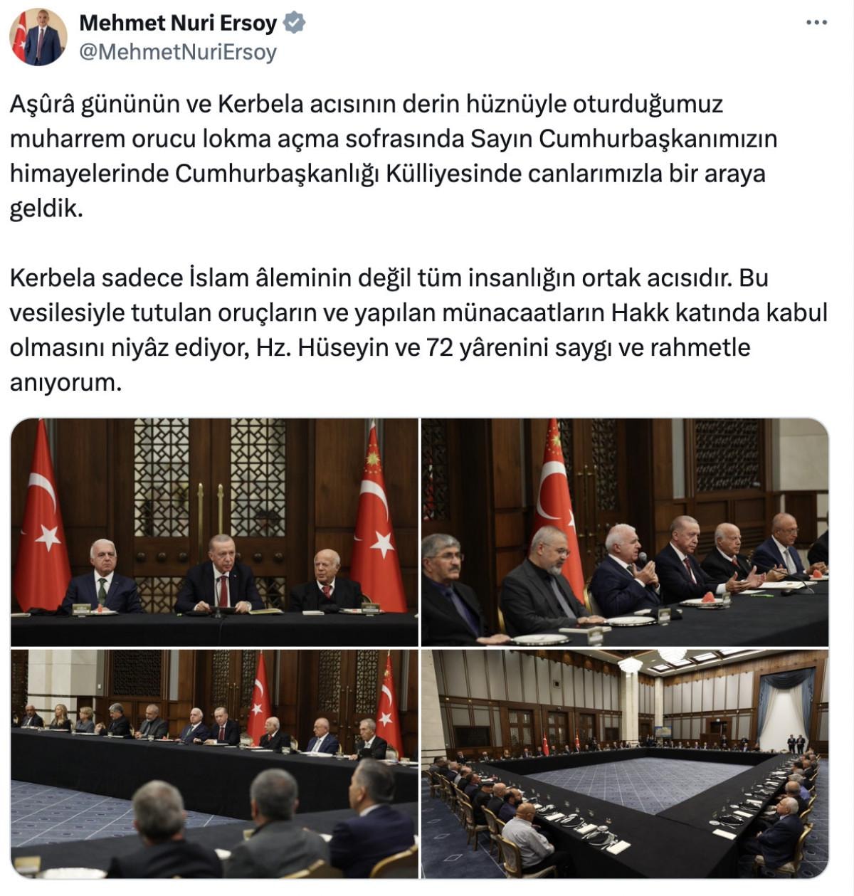 Twitter hesabından paylaşım yapan Ersoy mesajında, "Aşûrâ gününün ve Kerbela acısının derin hüznüyle oturduğumuz muharrem orucu lokma açma sofrasında Sayın Cumhurbaşkanımızın himayelerinde Cumhurbaşkanlığı Külliyesinde canlarımızla bir araya geldik." ifadelerine yer verdi;