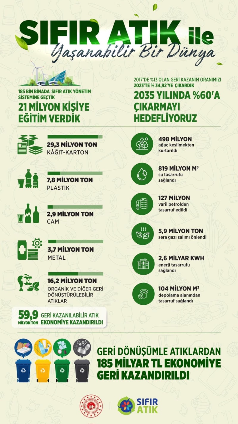59,9 milyon ton geri kazanılabilir atık ekonomiye kazandırılırken, geri dönüşümle atıklardan 185 milyar lira gelir sağlandı.