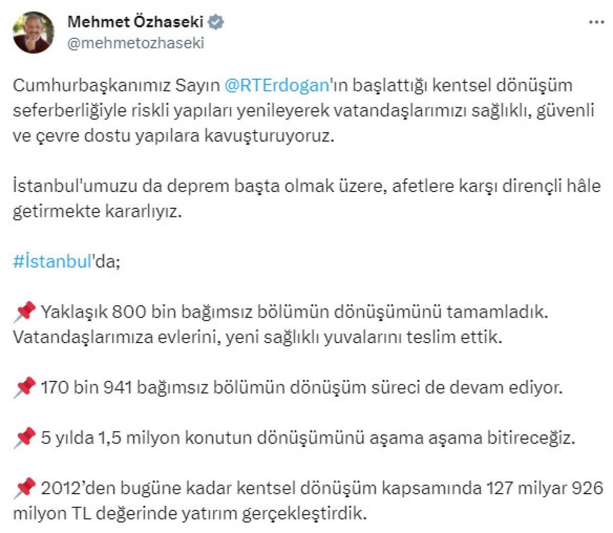 İstanbul'da; yaklaşık 800 bin bağımsız bölümün dönüşümünü tamamladık. Vatandaşlarımıza evlerini, yeni sağlıklı yuvalarını teslim ettik.