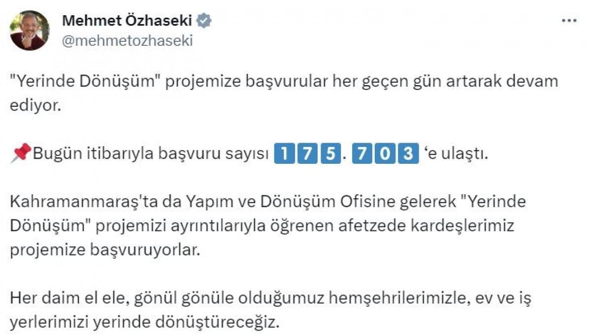 Yerinde Dönüşüm' projemize başvurular her geçen gün artarak devam ediyor. Bugün itibarıyla başvuru sayısı 175 bin 703'e ulaştı. Kahramanmaraş'ta da Yapım ve Dönüşüm Ofisine gelerek 'Yerinde Dönüşüm' projemizi ayrıntılarıyla öğrenen afetzede kardeşlerimiz projemize başvuruyorlar. Her daim el ele, gönül gönüle olduğumuz hemşehrilerimizle, ev ve iş yerlerimizi yerinde dönüştüreceğiz.
