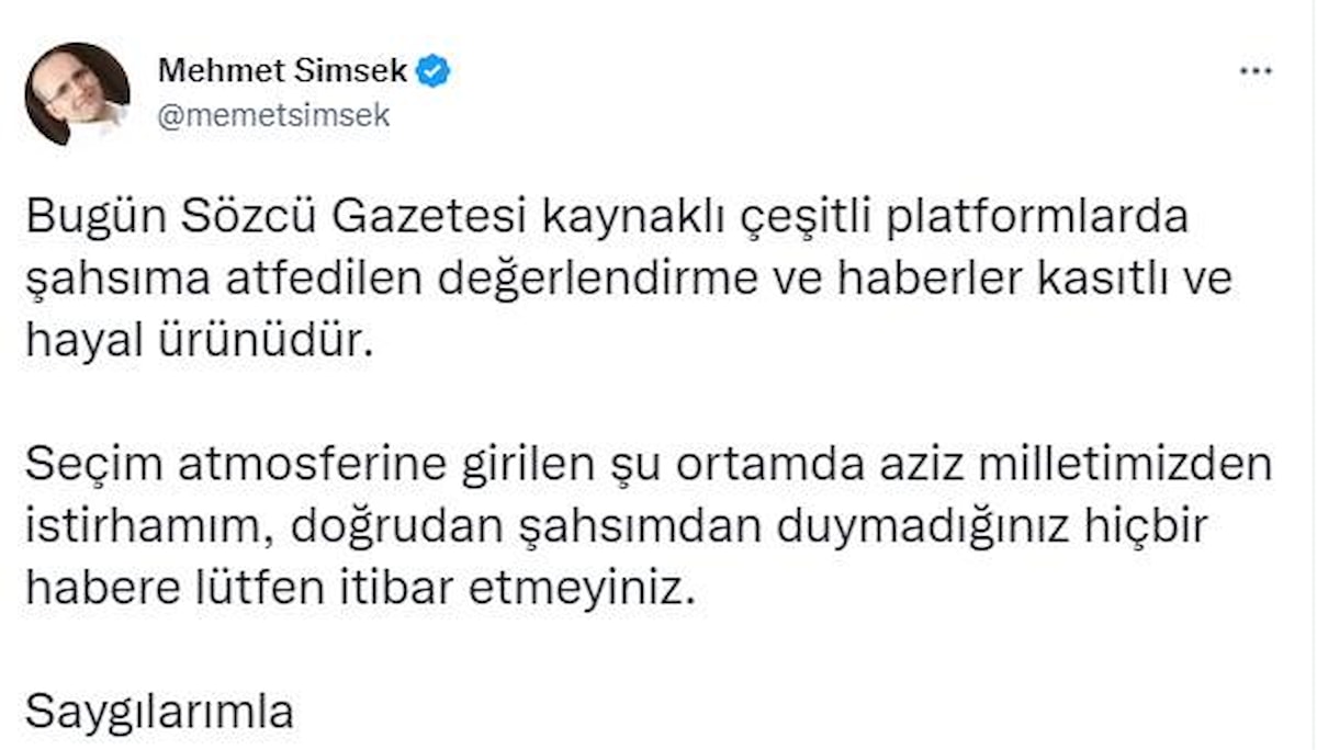 Hakkında çıkan iddiaların hiçbir gerçekliğinin olmadığını belirten Şimşek, "Çeşitli platformlarda şahsıma atfedilen değerlendirme ve haberler kasıtlı ve hayal ürünüdür.