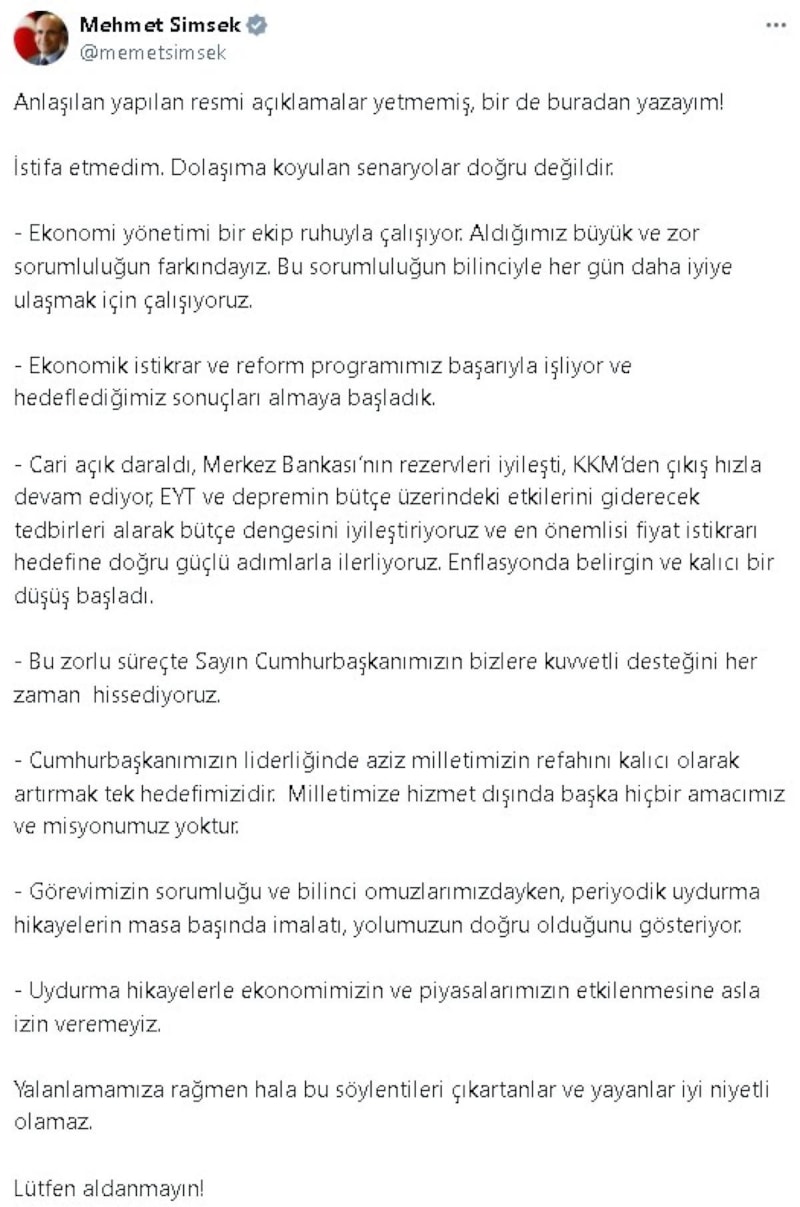 Hazine ve Maliye Bakanı Mehmet Şimşek, hakkındaki istifa iddialarını bu kez sosyal medya hesabından yalanladı.