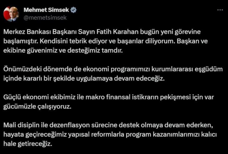 Hazine ve Maliye Bakanı Mehmet Şimşek, Türkiye Cumhuriyet Merkez Bankası (TCMB) Başkanı Fatih Karahan'ın göreve gelmesinin ardından sosyal medyadan bir paylaşım yaptı.