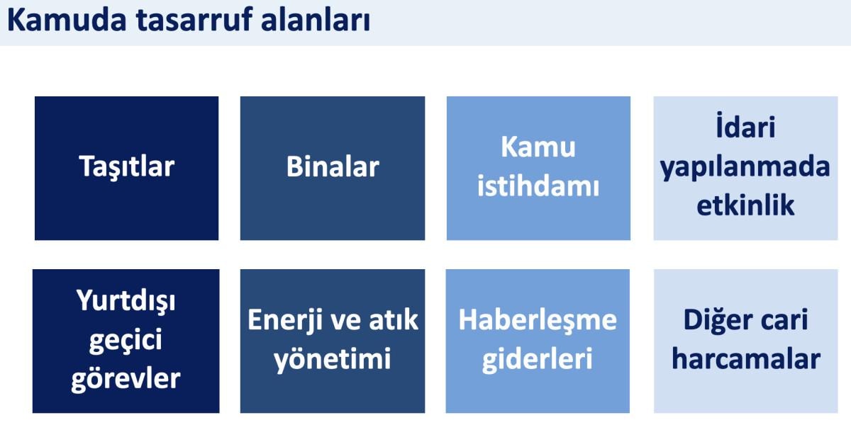 Konuşmasında kamuda tasarruf paketinde olan 8 öncelikli alanı açıklayan Şimşek, "Taşıtlar, binalar, kamu istihdamı, idari yapılanmada etkinlik, yurt dışı geçici görevler, enerji ve atık yönetimi, harcama giderleri ve diğer cari harcamalar." diyerek detaylandırdı.