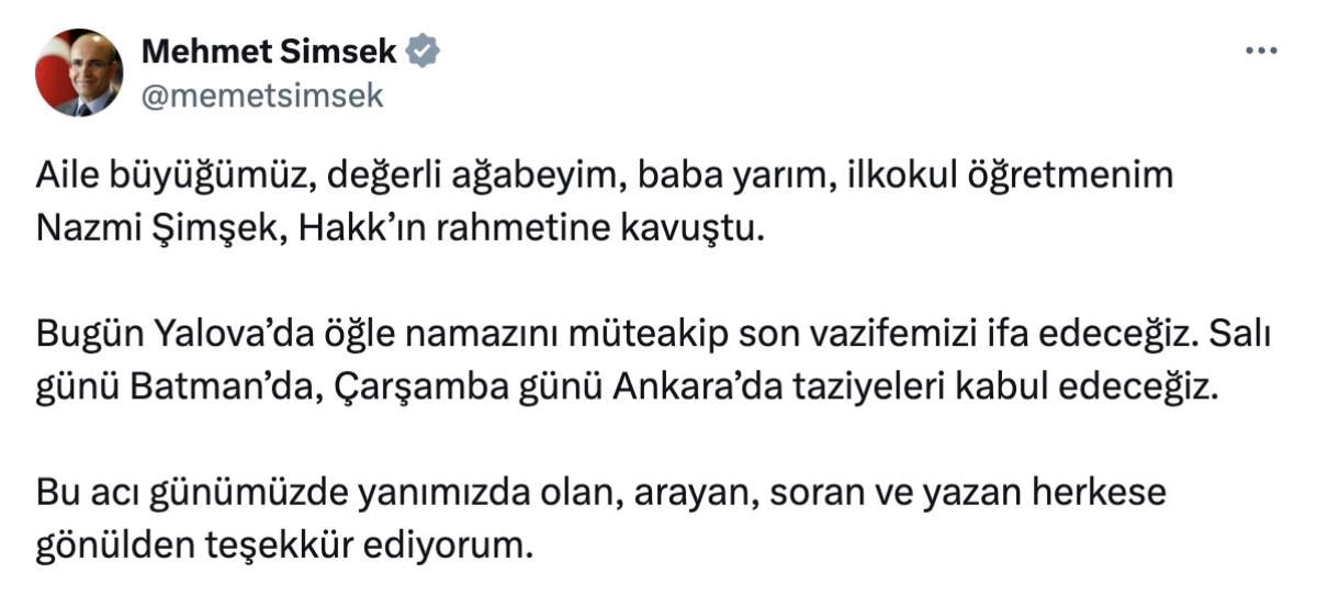 Hazine ve Maliye Bakanı Mehmet Şimşek'in emekli ilkokul öğretmeni ağabeyi 80 yaşındaki Nazmi Şimşek, Yalova’da hayatını kaybetti.