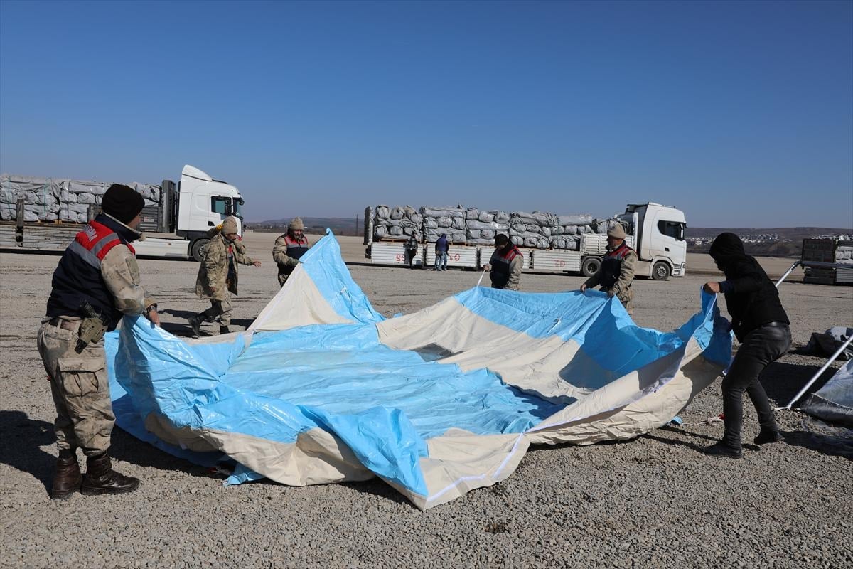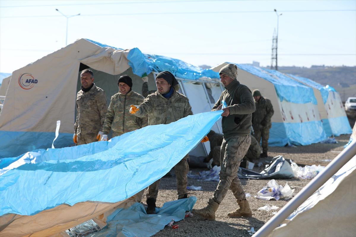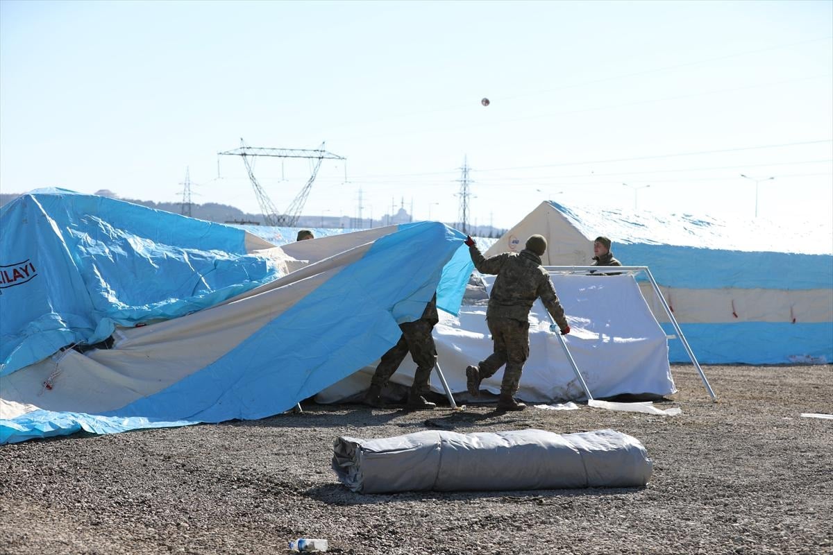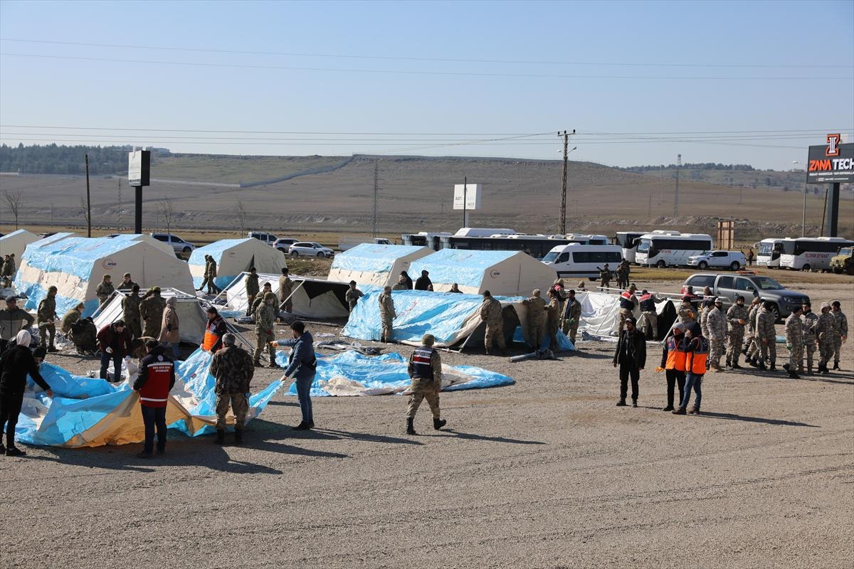 AFAD personeli başta olmak üzere, 7. Kolordu Komutanlığı'na bağlı askeri birlikler, İl Jandarma Komutanlığı personeli, güvenlik korucuları ve gönüllüler el birliğiyle çadır kurulumu yapıyor.