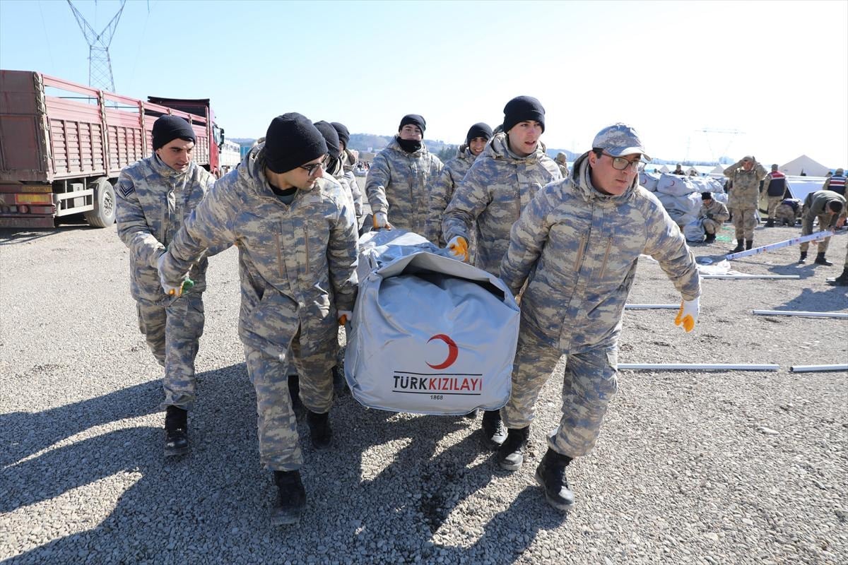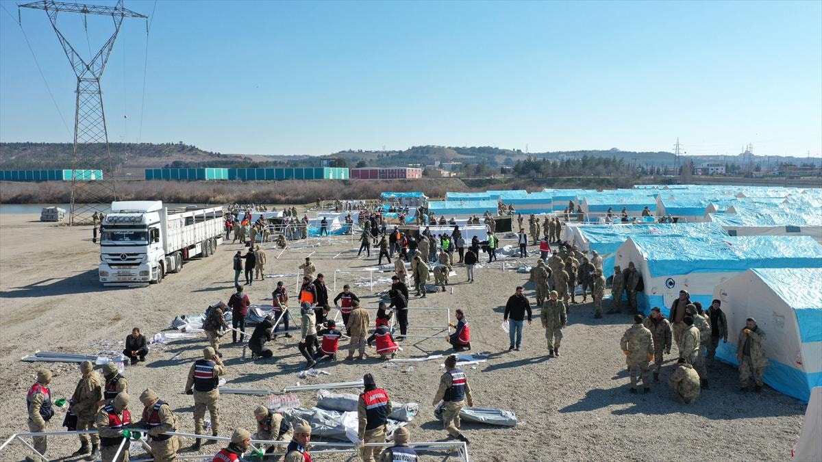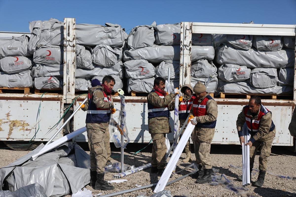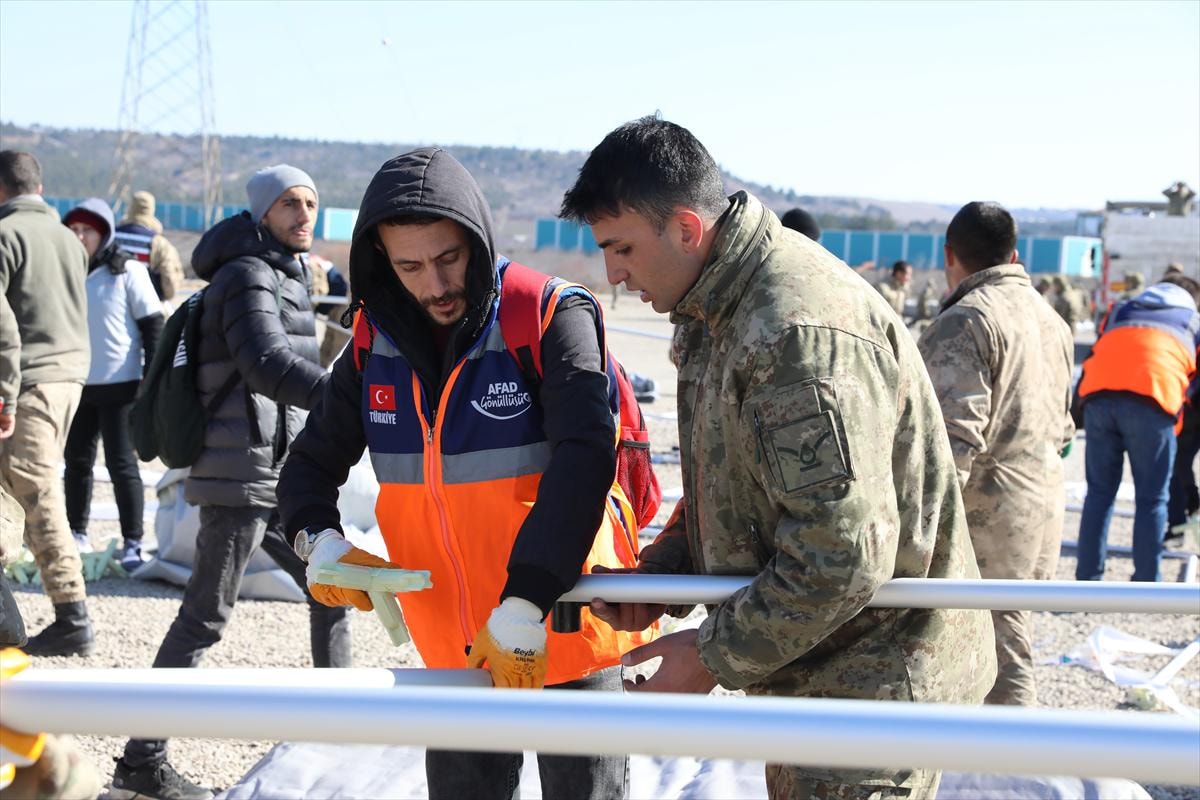 AFAD personeli başta olmak üzere, 7. Kolordu Komutanlığı'na bağlı askeri birlikler, İl Jandarma Komutanlığı personeli, güvenlik korucuları ve gönüllüler el birliğiyle çadır kurulumu yapıyor.