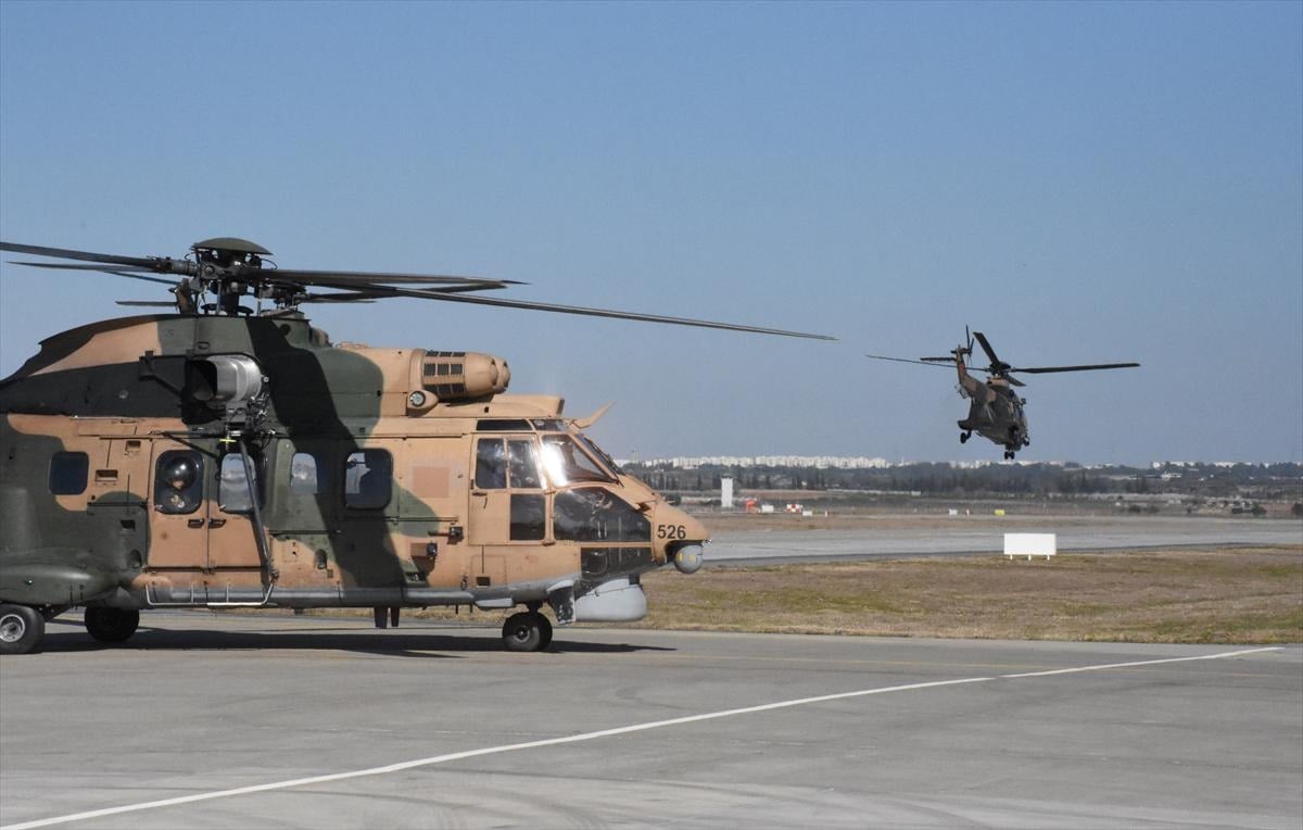 Kara, Deniz ve Hava Kuvvetleri, Özel Kuvvetler, Sahil Güvenlik ile Jandarma Genel komutanlıklarına ait çok sayıda helikopter ve kargo uçağı yoğun trafik içinde üsse manevra yapıyor.