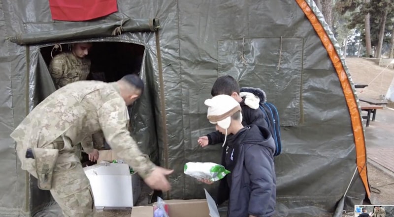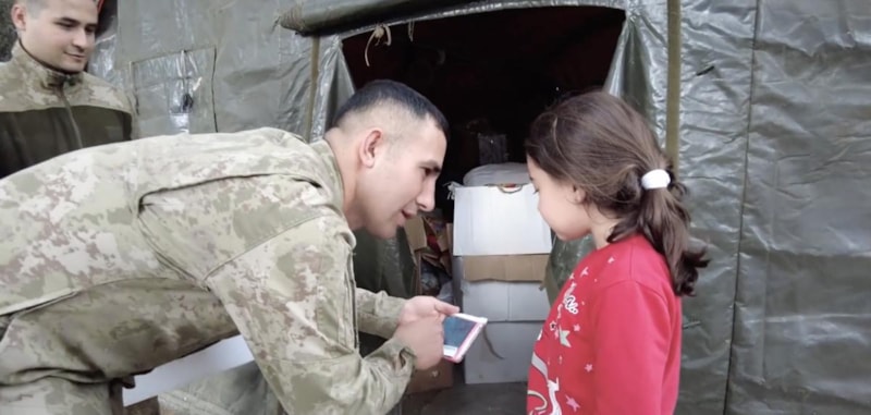 Görüntülerde, çocuklarla bir araya gelen askerlerin çocuklara oyuncak ve yiyecek dağıttığı anlar da yer alıyor.